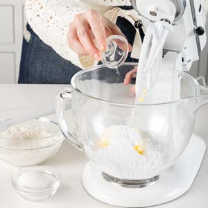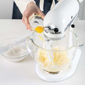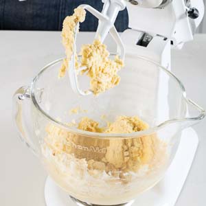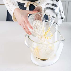 With mixer on low speed, gradually add flour, beating until just combined and stopping to scrape paddle and bottom and sides of bowl.