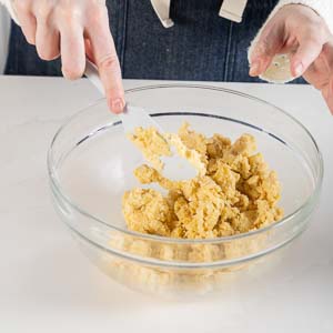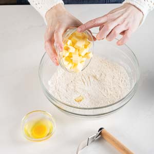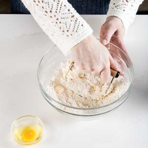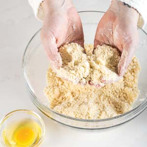 In a large bowl, whisk together flour, confectioners’ sugar, and salt. Using a pastry blender or your hands, cut in cold butter until mixture resembles coarse meal. Stir in egg until combined.