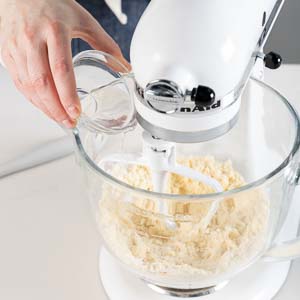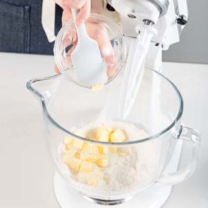 In the bowl of a stand mixer fitted with the paddle attachment, beat flour, sugar, and salt at low speed until combined. Add cold butter, and beat at medium-low speed until mixture is crumbly. With mixer on medium- low speed, add 1⁄4 cup (60 grams) ice water, beating just until dough comes together.