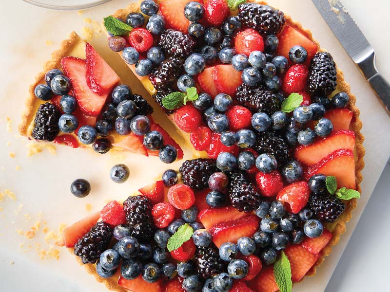 Just before serving, gently remove tart from pan, and top with berries as desired.