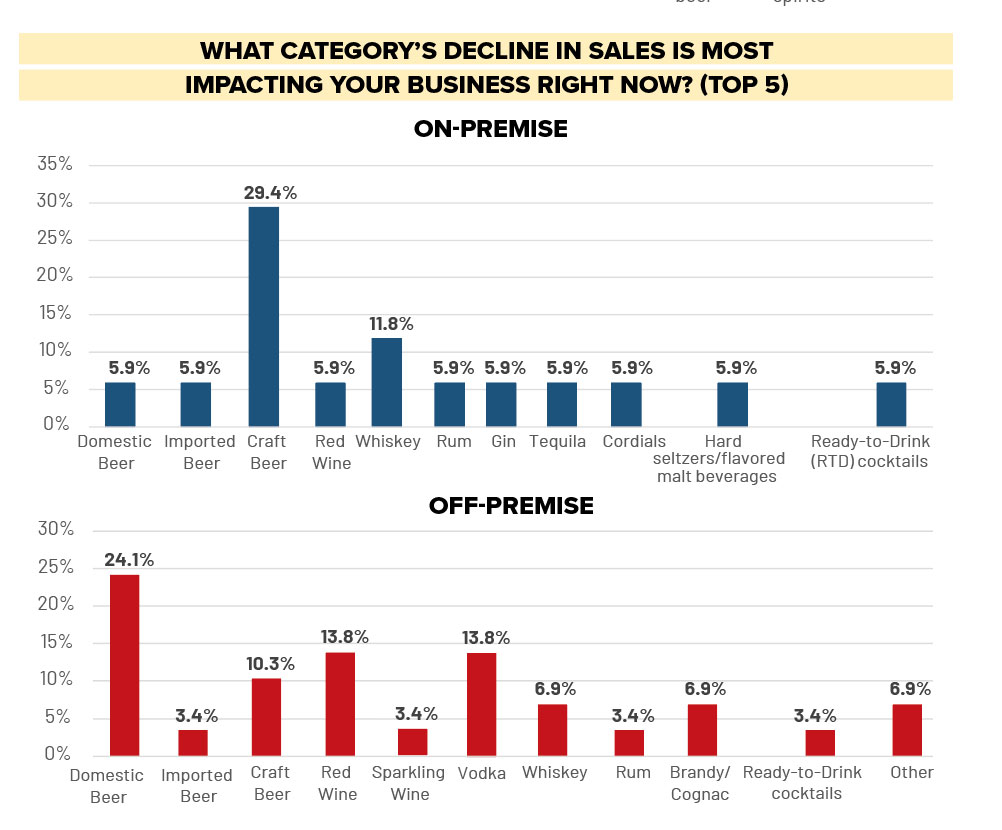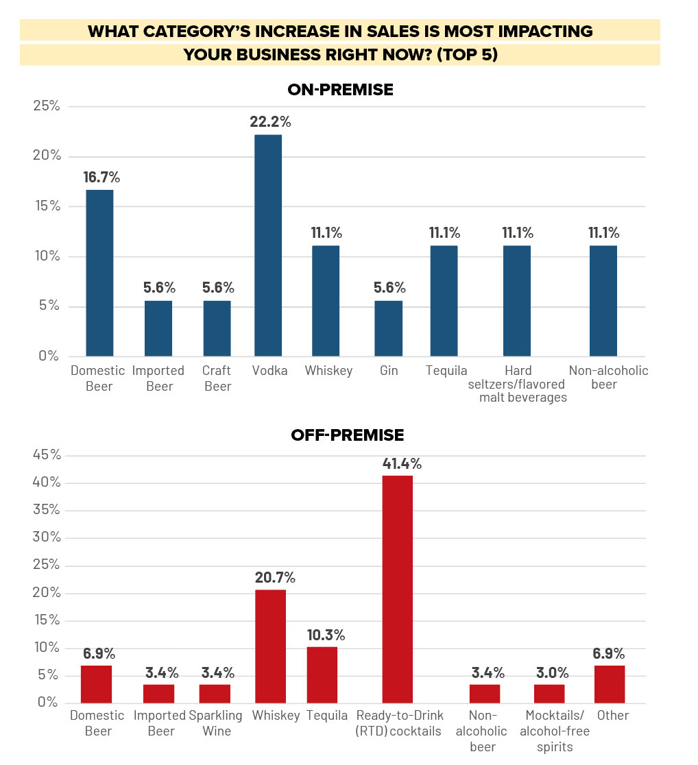 For bar and restaurants, vodka still pays the bills, as 22% said it was the category with an increase in sales most impacting business right now — twice as many that had reported tequila and whiskey as key growing categories. But nearly 19% of on-premise respondents said that RTDs were the category for which they would expand menu space, just behind tequila with 25%. RTDs also tied with mocktails/alcohol-free spirits as the category generating the most buzz on-premise.